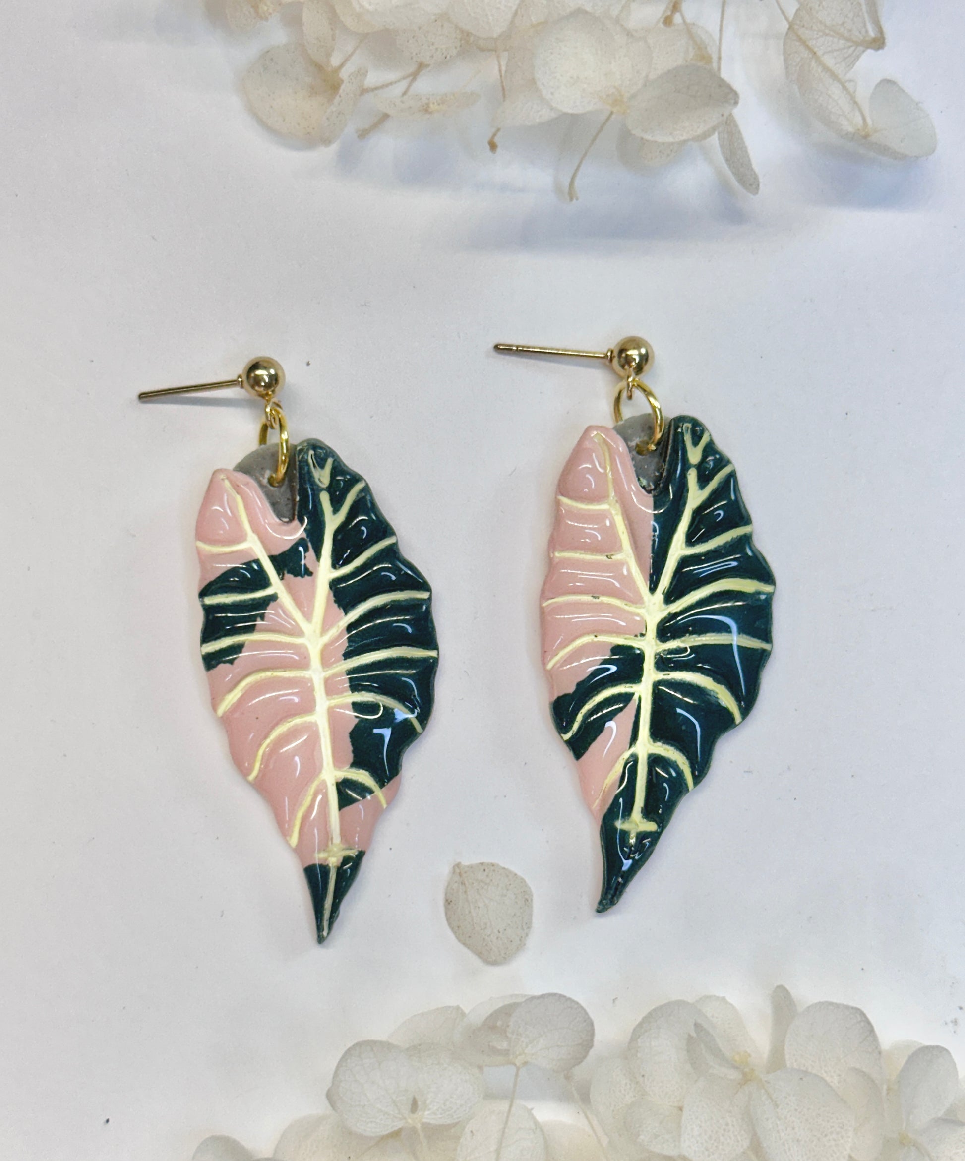 Bold and artistic—these Alocasia Amazonica earrings are inspired by the striking contrast of the Alocasia amazonica, featuring dramatic veins and an elegant elongated leaf shape. Each piece is hand-sculpted and painted in soft pink and deep emerald tones, symbolizing both strength and femininity. A statement piece for plant lovers and collectors of unique handmade jewelry.