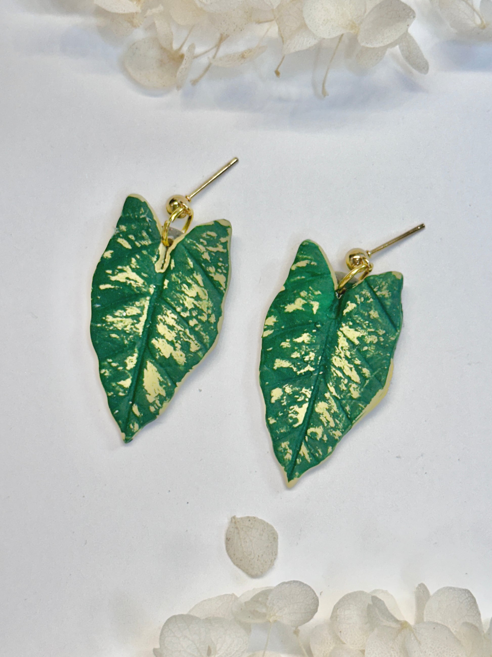 Vibrant and full of life—these Caladium Hilo Beauty earrings are inspired by the unique variegation of the tropical Caladium Hilo Beauty plant. Each leaf is hand-sculpted and painted to showcase the soft blend of creamy yellow and rich green tones, mirroring the natural beauty of its real-life counterpart. A true statement piece for plant enthusiasts and lovers of botanical art.