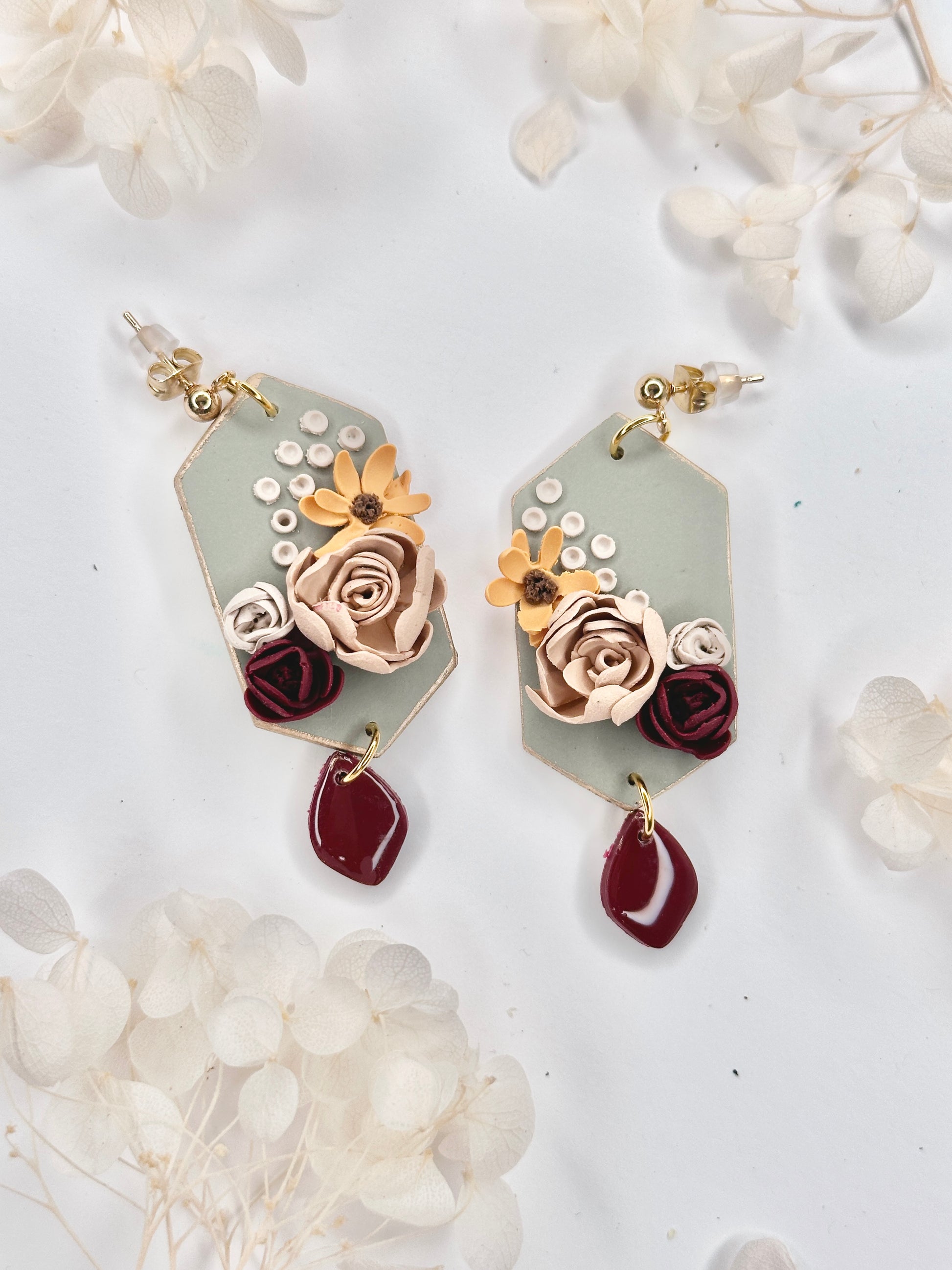 Sun-warmed sage dusted with terracotta roses, creamy roses, tiny mustard daisies, and pearl-like beads — like wildflowers caught in a golden-hour haze. A ruby teardrop swings below, sealing the spell.