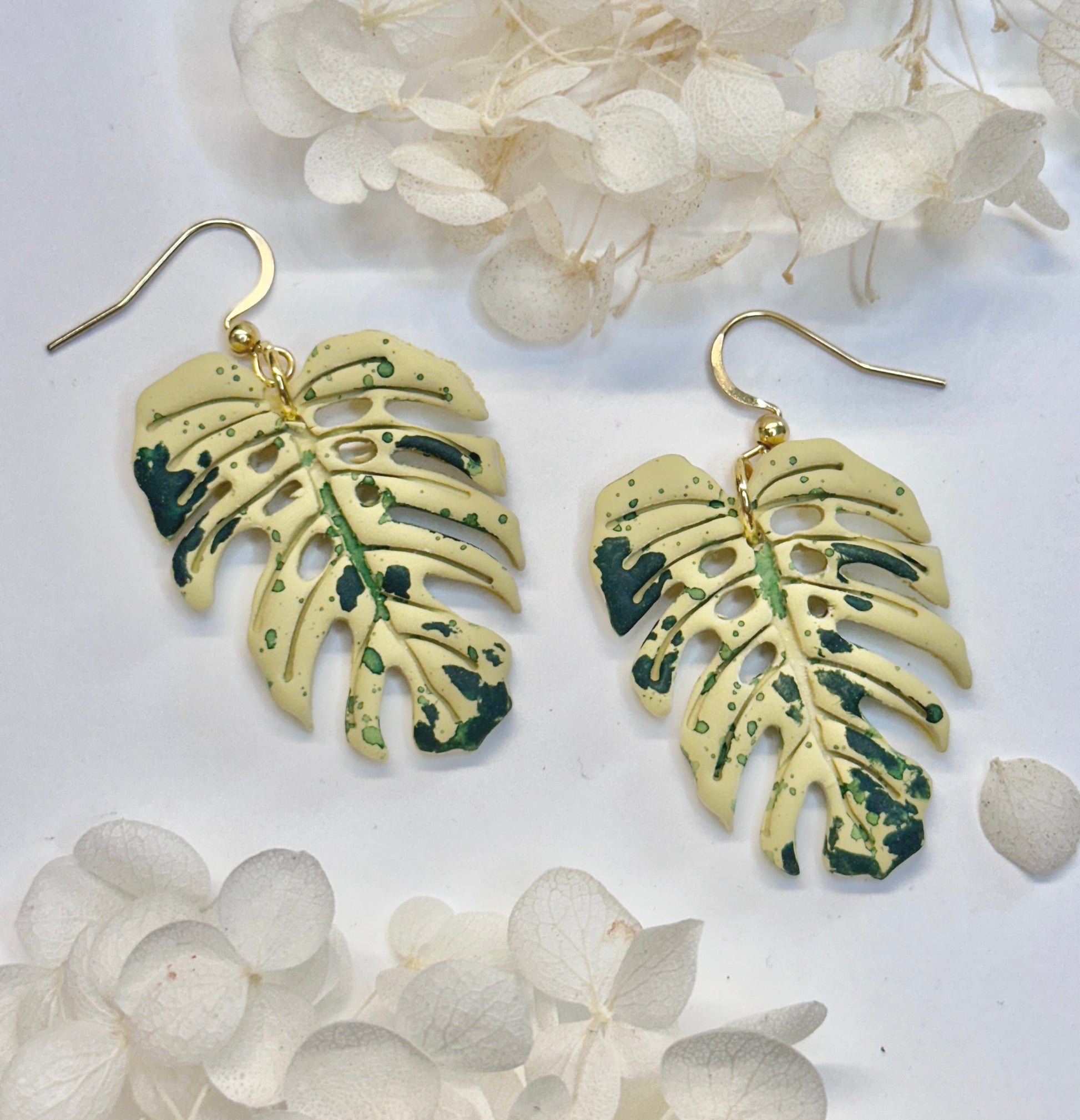 Striking and full of personality—these Monstera Albo earrings celebrate the rare beauty of the Monstera Albo Variegata. Each earring is hand-sculpted and detailed to capture the plant’s signature split leaves and creamy white-and-green marbling. A statement piece that embodies nature’s artistry—bold, elegant, and timeless.