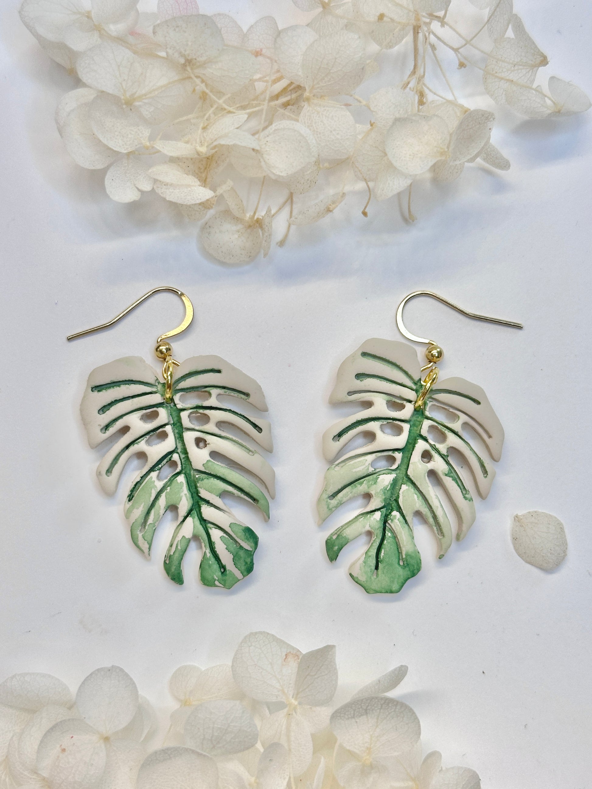 Elegant and rare—these Monstera White Devil earrings are inspired by the mesmerizing variegation of the Monstera deliciosa ‘White Devil’. Each earring is hand-sculpted and painted to capture the graceful blend of creamy white and soft green marbling, with intricate cutout details that mirror the plant’s natural fenestrations. A true collector’s piece for plant lovers and botanical jewelry enthusiasts.