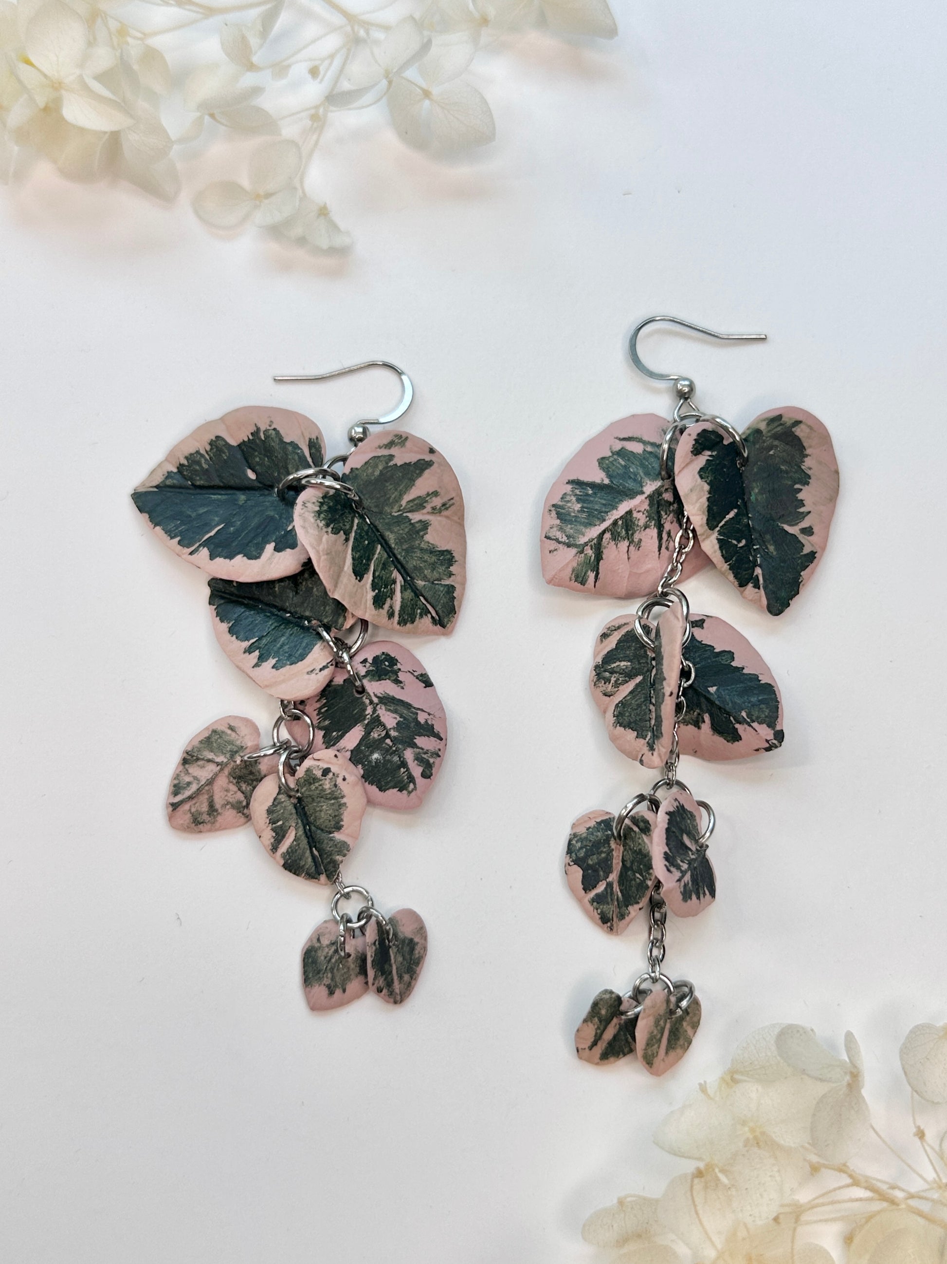 Graceful and full of detail—these Variegated String of Hearts earrings are inspired by the trailing beauty of the Ceropegia woodii variegata. Each heart-shaped leaf is individually sculpted and painted to capture the plant’s signature blend of blush pink and deep green variegation. The movement of layered leaves connected by silver chains gives these earrings an elegant, botanical look perfect for plant lovers and artful jewelry collectors.