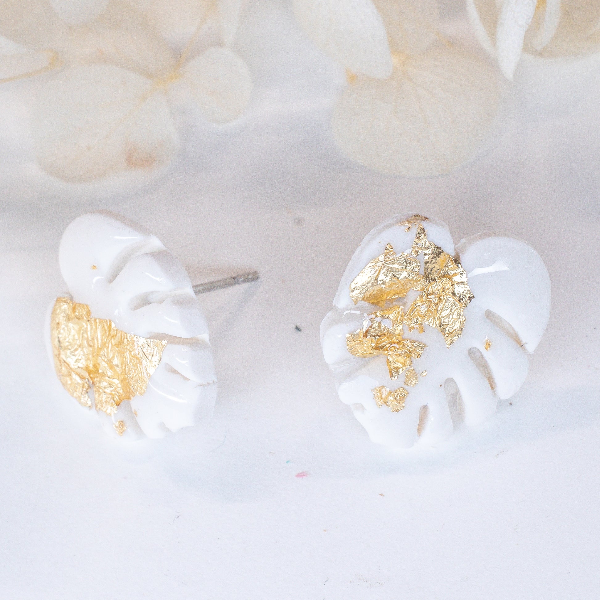 Soft and luminous—these White Monstera studs are inspired by the iconic split-leaf silhouette of the Monstera, reimagined in a clean white finish with delicate gold foil accents. Each piece is carefully hand-sculpted to highlight the leaf’s sculptural beauty, while the gold foil adds a warm, subtle glow. Elegant yet modern, these studs are perfect for everyday wear and for plant lovers drawn to quiet sophistication.